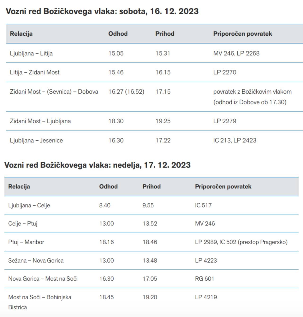 Slovenske železnice so objavile vozne rede Božičkovega vlaka, ki bo vozil v soboto, 16., in v nedeljo, 17. decembra.