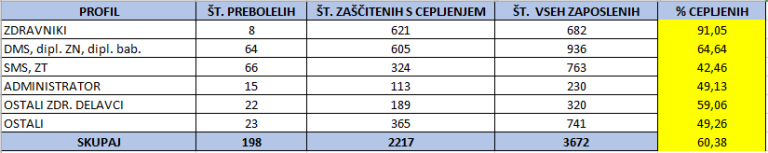 Cepljenih je 89 odstotkov zdravnikov in zobozdravnikov, 62 odstotkov diplomiranih medicinskih sester in 52 odstotkov srednjih medicinskih sester.