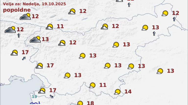 Jutri se bo oblačnost od zahoda zgostila, nekaj sonca bo še v vzhodnih krajih. Ponekod v zahodni Sloveniji bo popoldne začelo rahlo deževati. Pihal bo južni do jugozahodni veter. Najnižje jutranje temperature bodo od 1 do 5, na Primorskem okoli 8, najvišje dnevne od 12 do 18 stopinj Celzija.