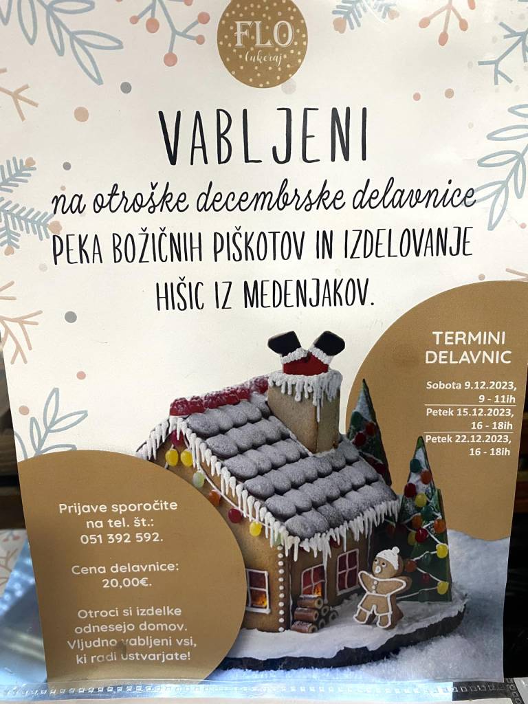 Kavarna FLO Cukeraj iz Ljutomera otroke vabi na decembrske delavnice, v katerih bodo sodelovali pri peki božičnih piškotov in izdelovali hišice iz medenjakov.
