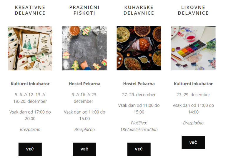 Peke prazničnih piškotov bodo potekale 9., 16. in 23. decembra, kuharske delavnice, na katerih bodo otroci kuhali praznične jedi in sladice 27., 28. in 29. decembra, likovne delavnice, ki so tudi brezplačne pa od 27. do 29. decembra.
