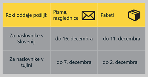 Priporočen rok oddaje pisemskih pošiljk za naslovnike v Sloveniji  je do 16. decembra, za naslovnike v tujini pa do 7. decembra.
