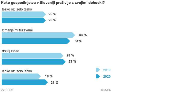 Odstotek gospodinjstev, ki so v letu 2020 ocenila, da so s svojimi dohodki preživela mesec brez težav – lahko oziroma zelo lahko – se je v primerjavi z letom poprej povečal za tri odstotne točke: z 18 na 21 odstotkov.