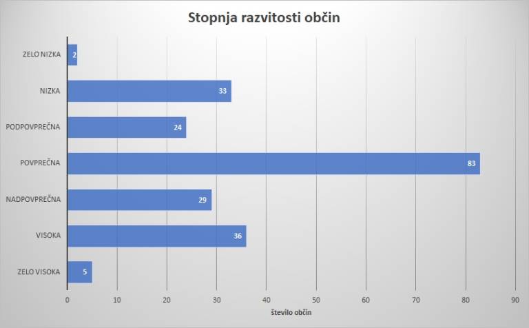 V najvišji kategoriji je zelo visoko stopnjo razvitosti doseglo le pet slovenskih občin, ki si sledijo po naslednjem vrstnem redu: Ljubljana, Trzin, Komenda, Cerklje na Gorenjskem in Naklo. Te občine izstopajo po visoki stopnji razvoja na področjih življenjskega standarda, razvitega gospodarstva, socialne kohezije in varovanja okolja. Z visoko stopnjo razvitosti je ocenjenih 36 krajev, treba pa je poudariti, da so na vrhu občine iz osrednjeslovenske in gorenjske regije. V severnoprimorski regiji je sedem visoko razvitih občin, po dve sta v jugovzhodni Sloveniji, obalno-kraški in primorsko-notranjski regiji.