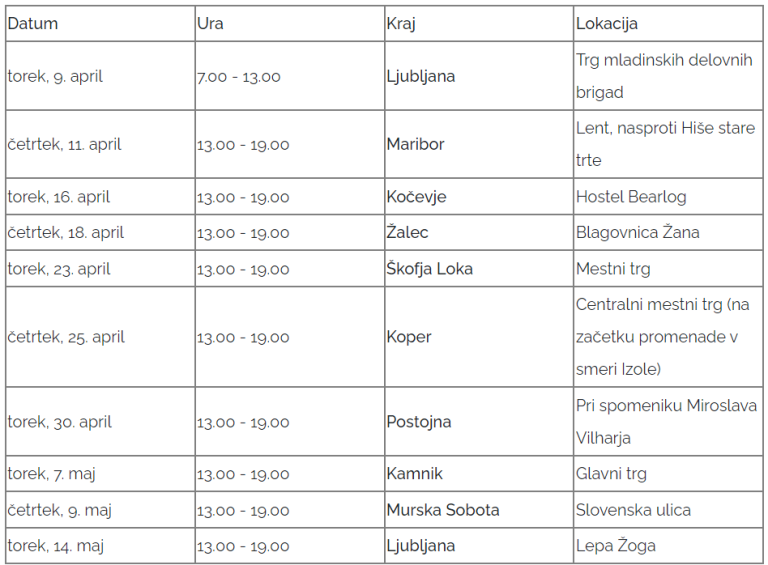 Serviserji bodo na mobilni servisni delavnici opravljali lažja servisna opravila, o morebitnih večjih popravilih pa vam bodo svetovali kako naprej. Kot še pravijo, je dobro svoj prihod potrditi na Facebook dogodku kraja, kjer boste obiskali servis, saj se lahko zgodi tudi čakalna doba, še opozarjajo. V tabeli spodaj preverite, kdaj bo brezplačen servis v vašem mestu.
