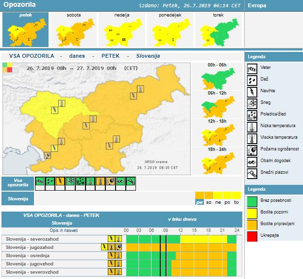 Arso je zaradi velike toplotne obremenitve in nevarnosti neviht sicer izdal oranžni alarm za večji del države. Kot so zapisali, bodo danes popoldne in zvečer ob nevihtah možna krajevna neurja z nalivi, sunki vetra in točo. Vse do jutri bo po nižinah sredi dneva in popoldne še velika toplotna obremenitev.