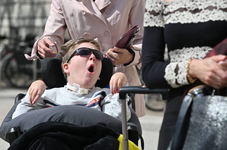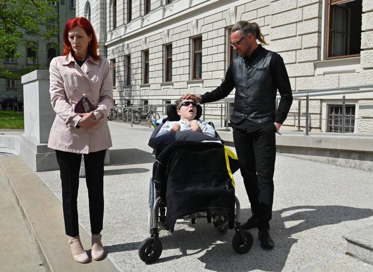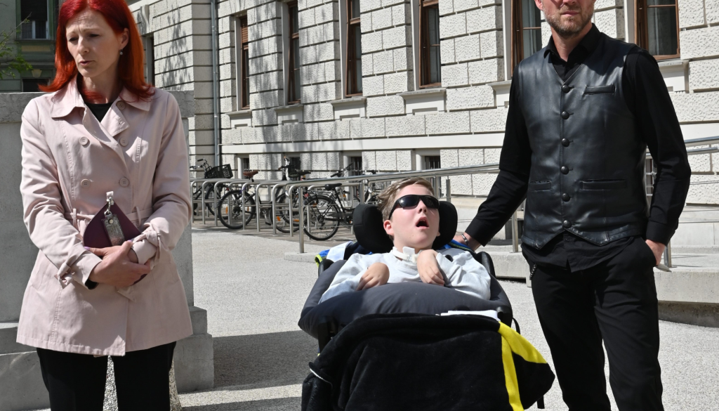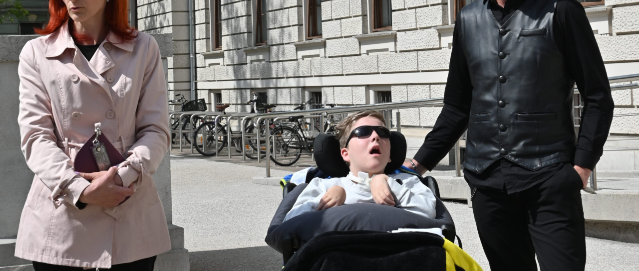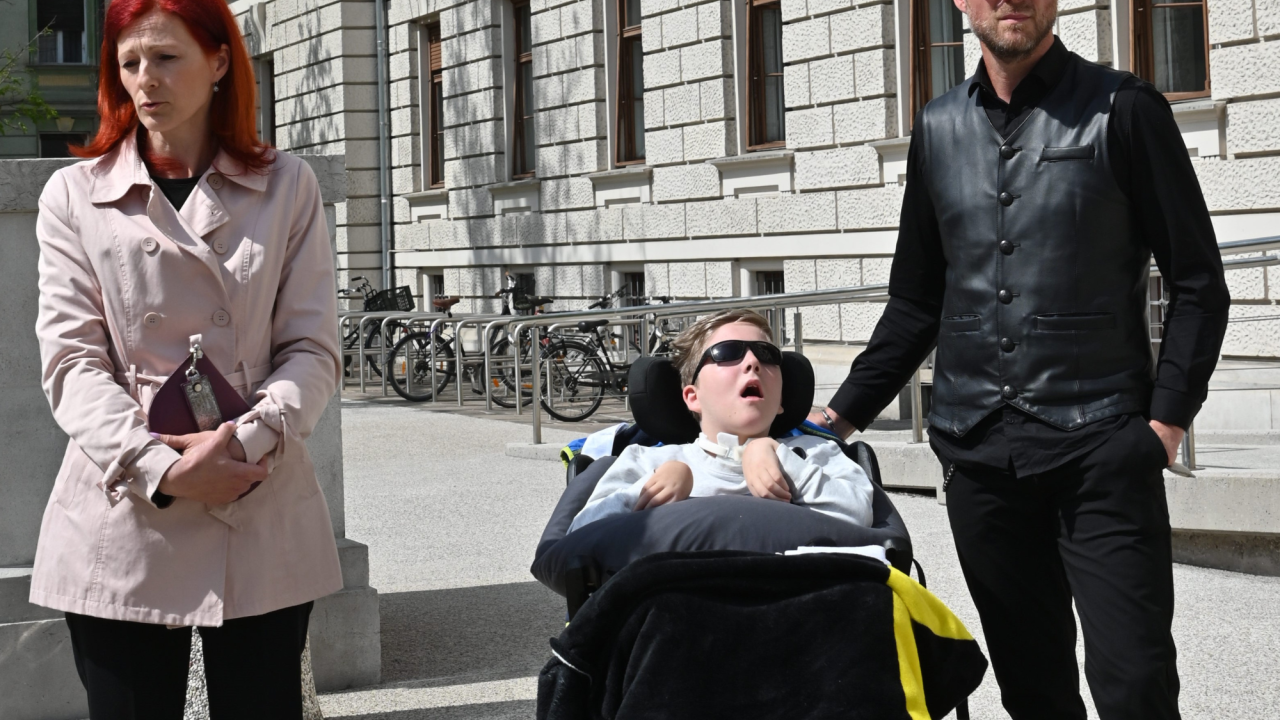 Na sodišču so se zglasili starša Mateja in Peter Peterka ter mladoletni otrok Julijan na invalidskem vozičku ter njihova odvetnica Nina Cek ter odvetniki, ki zastopajo Univerzitetni klinični center Ljubljana ter zavarovalnico.