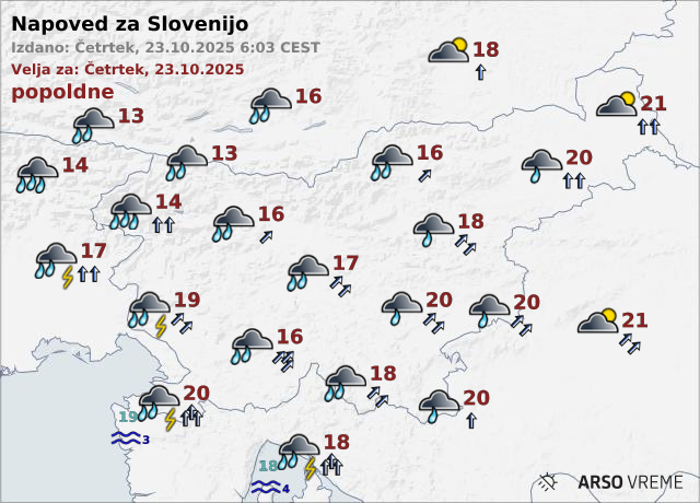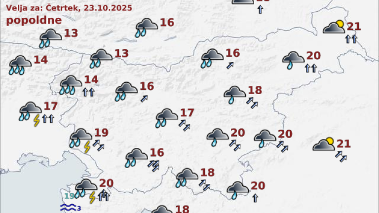 Dež na zahodu se bo čez dan krepil in do večera zajel vso Slovenijo. Vetrovno bo, pihal bo okrepljen južni do jugozahodni veter. Ob prehodu hladne fronte bodo zvečer tudi nevihte z nalivi.
