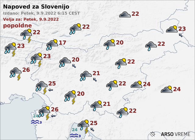 Danes bo pretežno oblačno z občasnimi padavinami in nevihtami. Jutri bo dopoldne sončno, popoldne pa bodo nastajale posamezne plohe in nevihte.