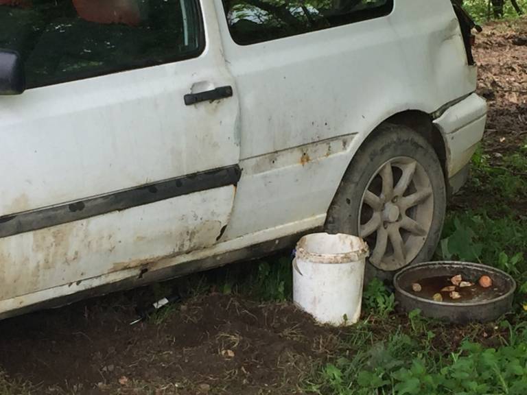 Psička Mija je živela v grozljivih razmerah, pod zapuščenim avtomobilom. Zdaj išče dom.