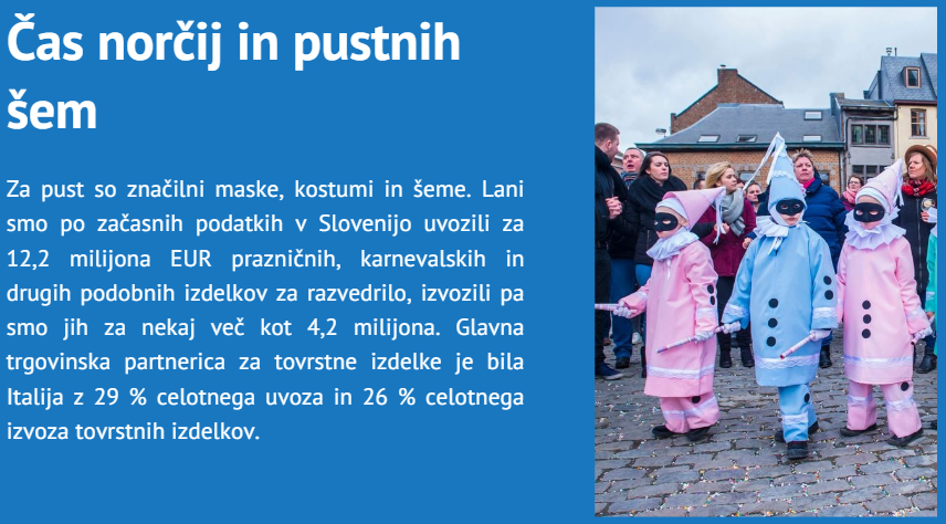 Statistični podatki Statističnega urada Republike Slovenije kažejo, da ima pust pomemben vpliv tudi na gospodarstvo. Lani smo v Slovenijo uvozili kar za 12,2 milijona evrov pustnih mask, kostumov in drugih rekvizitov, izvozili pa smo jih za 4,2 milijona evrov.