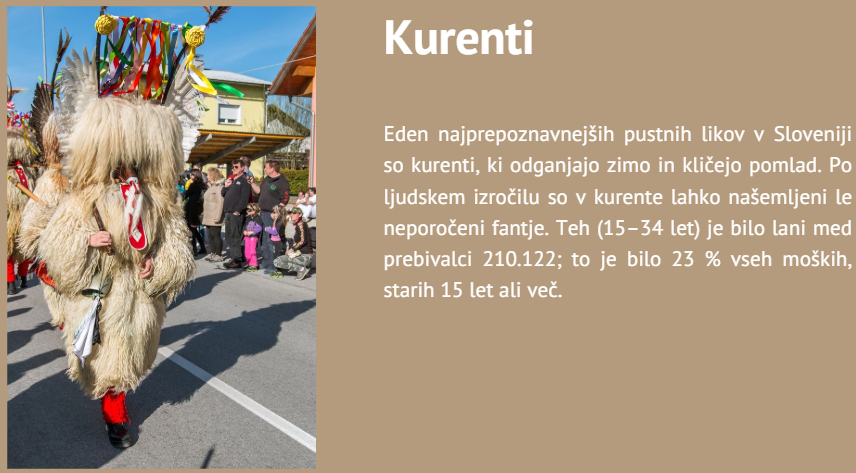 Pust si težko predstavljamo brez kurentov, ene najbolj prepoznavnih slovenskih pustnih šem. Po ljudskem izročilu se v kurenta lahko našemijo le neporočeni fantje, stari med 15 in 34 let. Po zadnjih podatkih je bilo v tej starostni skupini 210.122 moških, kar predstavlja 23 odstotkov vseh moških v Sloveniji.
