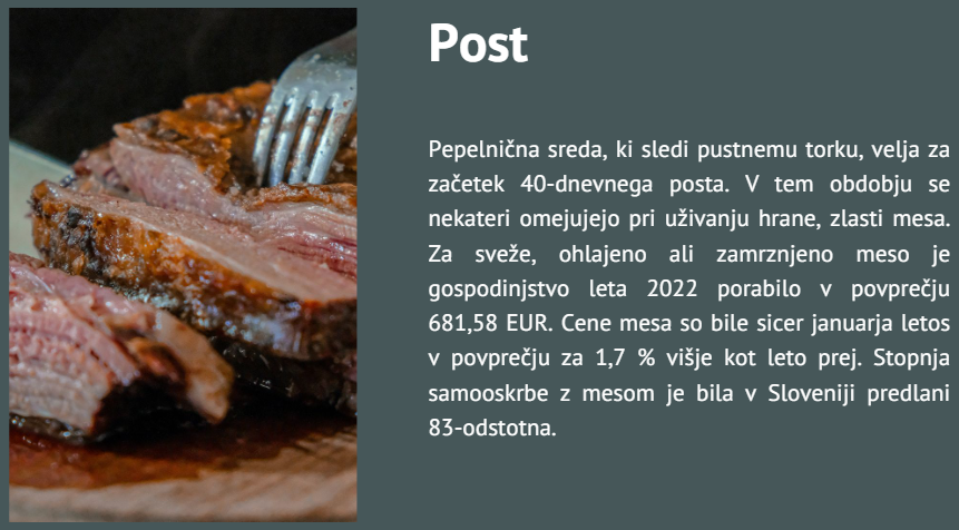 Po podatkih Statističnega urada Republike Slovenije je gospodinjstvo v Sloveniji leta 2022 za meso porabilo povprečno 681,58 evra, cene mesa pa so bile januarja letos za 1,7 odstotka višje kot leto prej.