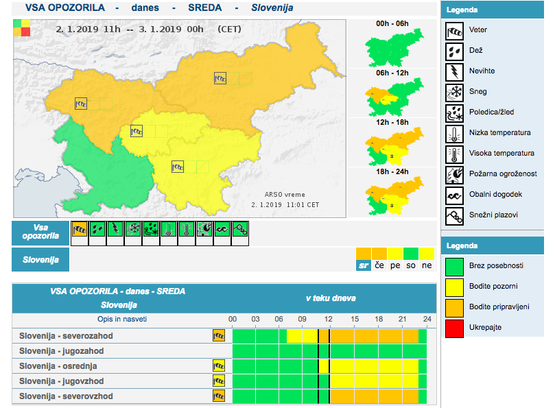 Agencija Republike Slovenije za okolje je izdala tudi opozorilo pred močnim vetrom. Najmočnejši sunki severnega vetra lahko danes popoldne, ponoči in jutri dopoldne predvsem po nižinah severnega dela Slovenije ponekod presežejo hitrost 70 kilometrov na uro. Okrepljen veter severnih smeri bo najbolj izrazit na severu države.