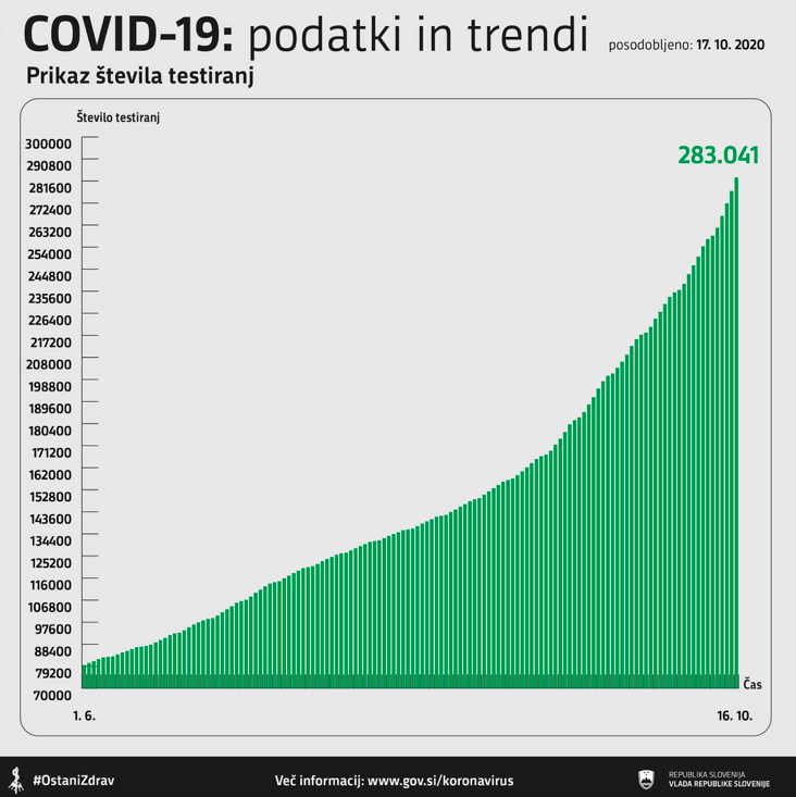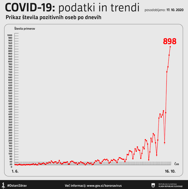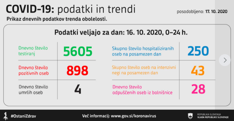 V Sloveniji so v petek, 16. oktobra, opravili 5605 testiranj na koronavirus in potrdili ponovno rekordnih 898 novih okužb.