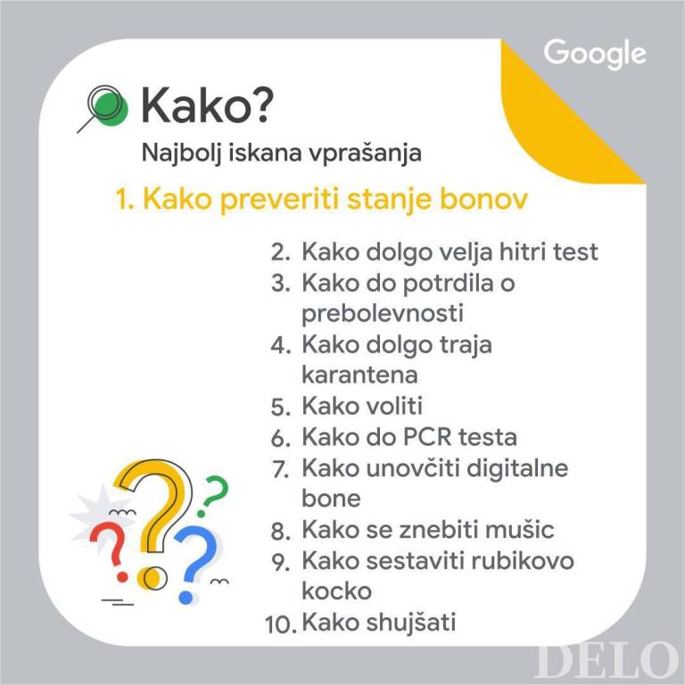 Na koronavirus se nanašajo tudi ostala vprašanja, in sicer je Slovence zanimalo, kako dolgo traja karantena, kako do PCR testa, pa tudi kako voliti, kako unovčiti digitalne bone, kako se znebiti mušic, kako sestaviti Rubikovo kocko in kako shujšati.