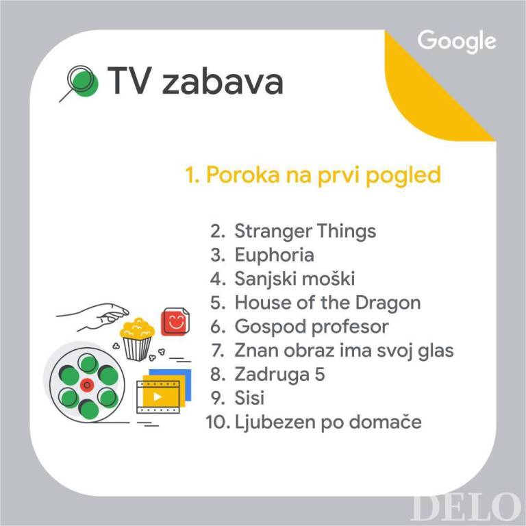 Poglejmo si še področje televizije in zabave. Naše računalnike in mobilne telefone je popolnoma prevzela Poroka na prvi pogled, ki ji na drugem mestu sledi televizijska serija Stranger Things in na tretjem serija Evforija.