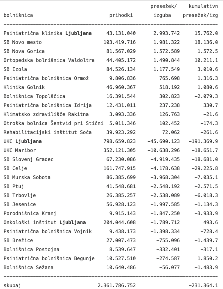 Lansko leto je z izgubo zaključilo 15 od 27 bolnišnic, kažejo podatki Združenja zdravstvenih zavodov Slovenije. Največjo izgubo, to je 45,7 milijona evrov, je imel UKC Ljubljana, sledi UKC Maribor z 10,6 milijona evrov izgube. Na tretjem mestu je SB Slovenj Gradec s slabimi petimi milijoni evrov izgube, SB Celje in SB Murska Sobota pa imata okoli štiri milijone evrov izgube.