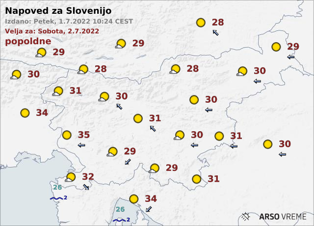 Najvišje dnevne temperature bodo od 28 do 32, na Goriškem in v Vipavski dolini do 35 stopinj Celzija.