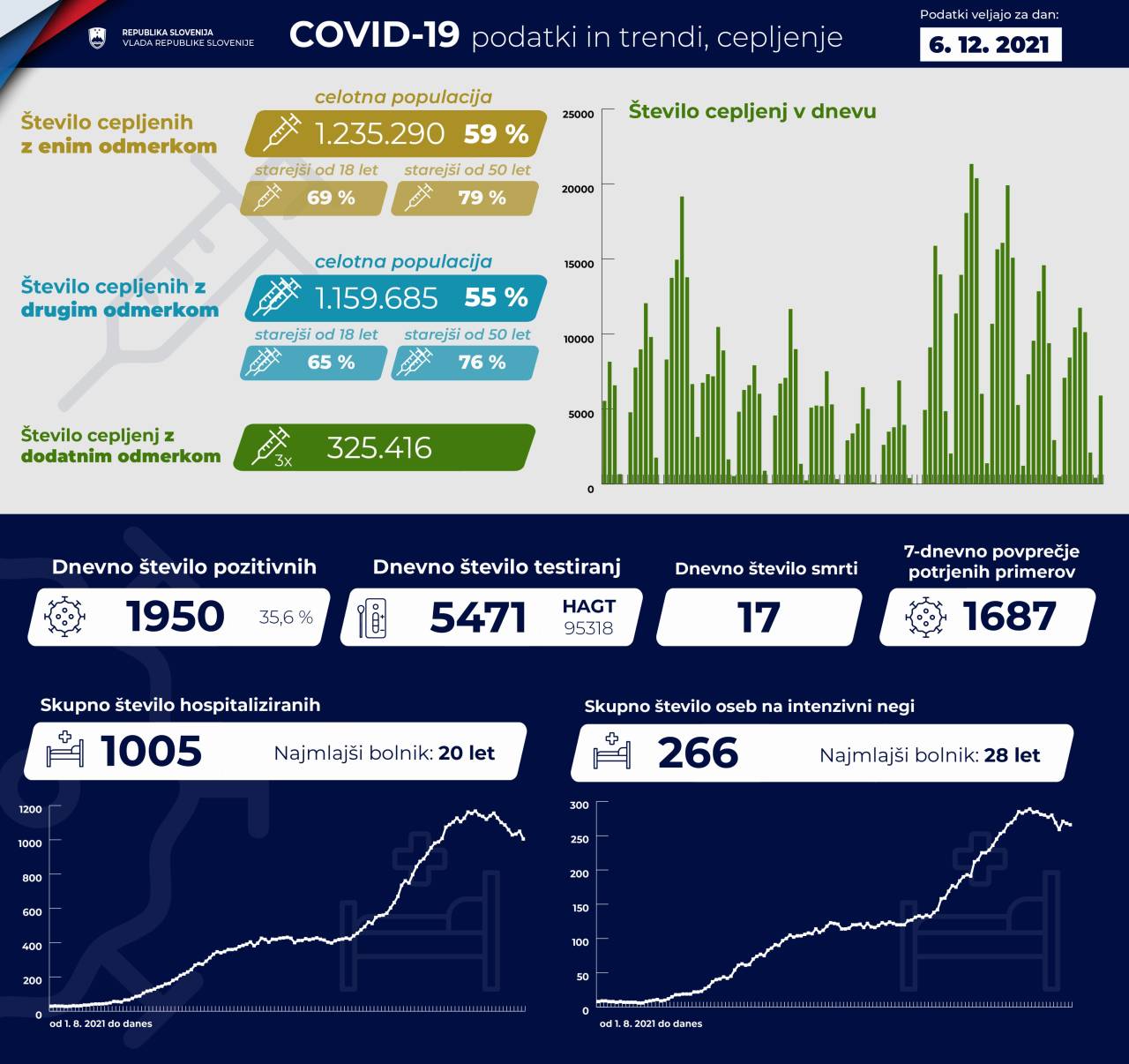 V Sloveniji so včeraj, 6. decembra, opravili 5471 PCR testiranj na koronavirus in potrdili 1950 novih okužb, gre za 35,6-odstotni delež okužb.