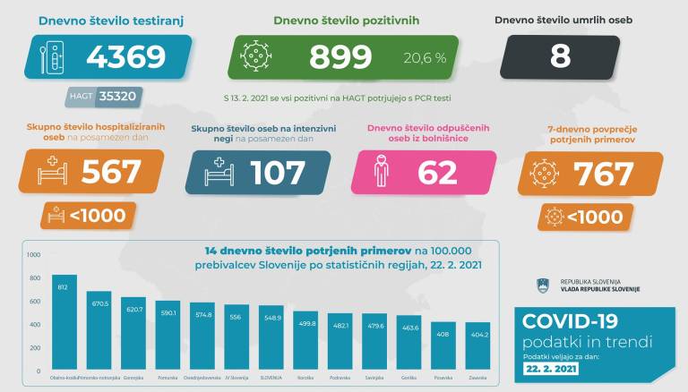 V Sloveniji so včeraj, 22. februarja, opravili 4369 PCR testiranj na koronavirus in potrdili 899 novih okužb, gre za 20,6 odstotni delež okužb.