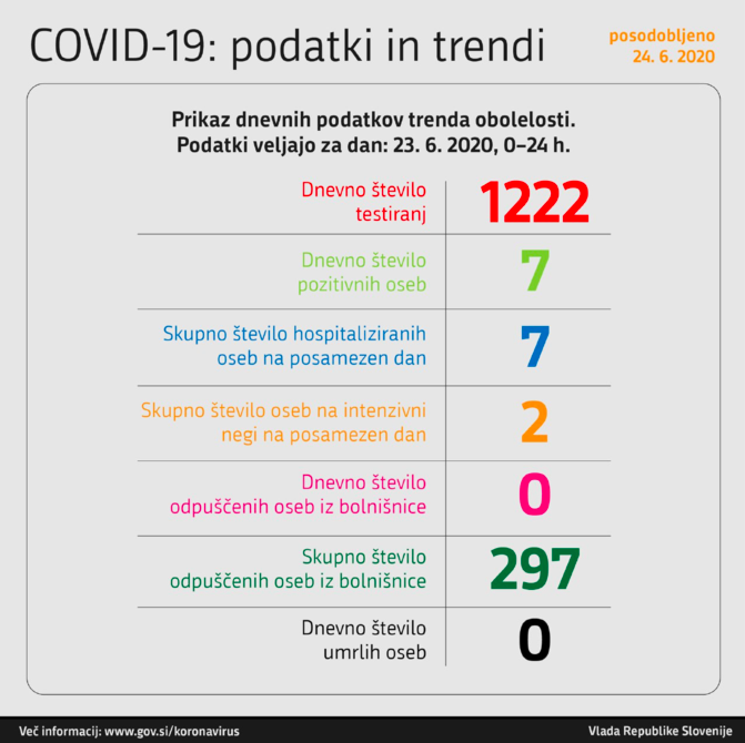 Po zadnjih podatkih, ki jih je sporočila vlada, je bilo včeraj v štiriindvajsetih urah opravljenih 1222 testiranj, od tega je bilo sedem oseb pozitivnih na novi koronavirus.