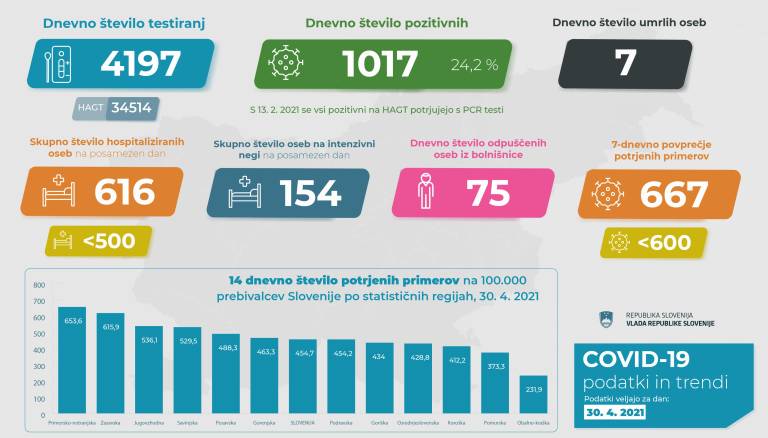 V Sloveniji so včeraj, 30. aprila, opravili 4197 PCR testiranj na koronavirus in potrdili 1017 novih okužb, gre za 24,2-odstotni delež okužb. Aktivnih primerov je po podatkih Covid-19 Sledilnika trenutno 9640.