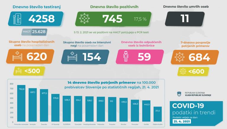 V Sloveniji so včeraj, 21. aprila, opravili 4858 PCR testiranj na koronavirus in potrdili 745 novih okužb, gre za 17,5-odstotni delež okužb.