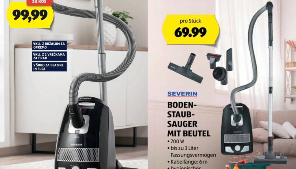 Na obeh je prikazan enak sesalnik podjetja Severin, vendar z občutno razliko v ceni. Medtem ko je v Sloveniji na voljo za 99,99 evra, je v Avstriji cena istega izdelka le 69,99 evra. Poleg tega ima sesalnik pri nas dvoletno garancijo, pri sosedih pa triletno garancijo.