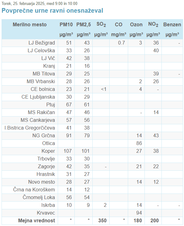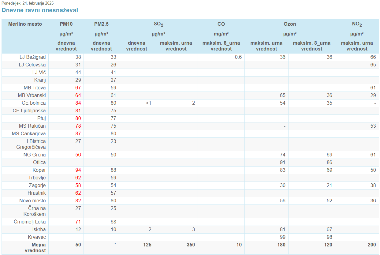 Današnje meritve, 25. februarja 2025, sicer kažejo rahlo izboljšanje, a vrednosti še vedno ostajajo visoke.