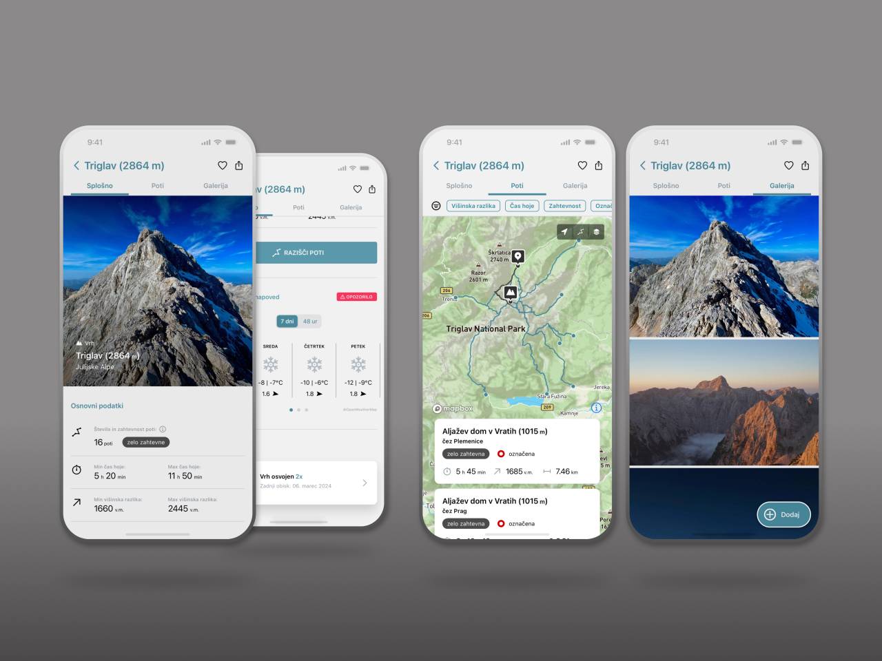 APPEAK namreč poleg osnovnih informacij o izhodiščih, poteh in vrhovih, kot so nadmorska višina, število in zahtevnost poti, čas hoje in višinska razlika, ponuja tudi aktualizirane podatke o vremenskih razmerah ter seznam obvezne pohodniške opreme. Med pohodom pa z navigacijo in izrisom poti na 2D in 3D zemljevidih pomaga spremljati potek poti od izhodišča do cilja.