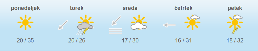 Jutranje temperature bodo od 16 do 23, najvišje dnevne od 23 do 28, na Primorskem in jugovzhodu do 32 stopinj Celzija.