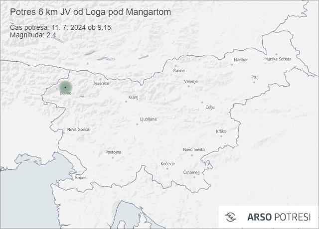 Žarišče šibkega potresnega sunka magnitude 2,4 je bil po prvih podatkih 75 kilometrov severozahodno od Ljubljane, v bližini Loga pod Mangartom.