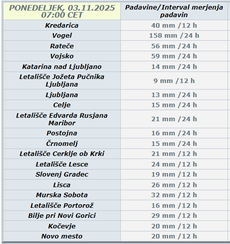 Po podatkih Agencije Republike Slovenije za okolje je bilo do 7. ure največ dežja izmerjenega na Voglu, kar 158 litrov na kvadratni meter.