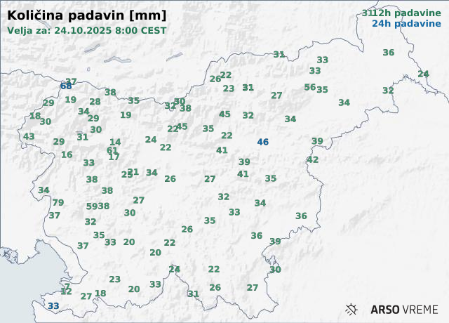 Največ dežja je padlo prav na območjih, kjer je fronta naletela na gorske pregrade. Na Voglu so meteorologi izmerili kar 124 milimetrov padavin v zadnjih 24 urah, na Vojskem 113 milimetrov, v Ratečah 68 milimetrov, v Postojni pa 63 milimetrov.