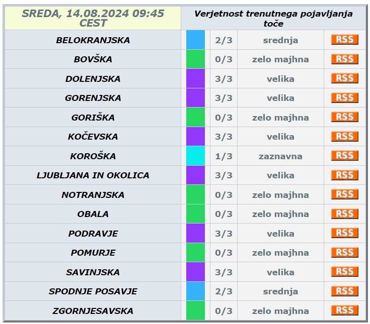 Vijoličasto opozorilo za veliko verjetnost trenutnega pojavljanja toče trenutno velja za Dolenjsko, Gorenjsko, Kočevsko, Ljubljano in okolico, Podravje in Savinjsko.