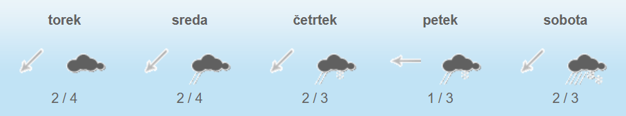 Najnižje jutranje temperature bodo od 0 do 3, v alpskih dolinah do -3, na Primorskem okoli 4, najvišje dnevne od 0 do 4, na Primorskem do 10 stopinj Celzija.