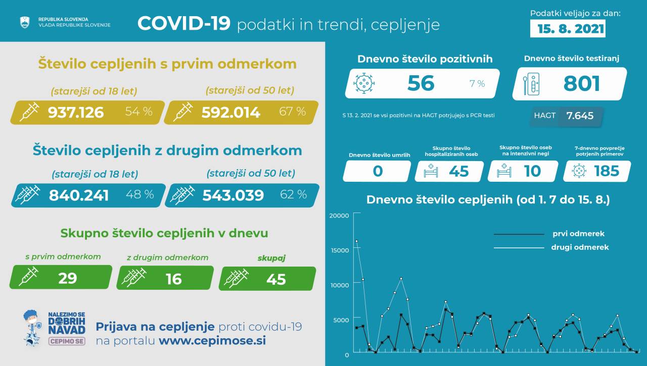 V Sloveniji so včeraj, 15. avgusta, opravili 801 PCR testov na koronavirus in potrdili 56 novih okužb, gre za 6,9-odstotni delež okužb.