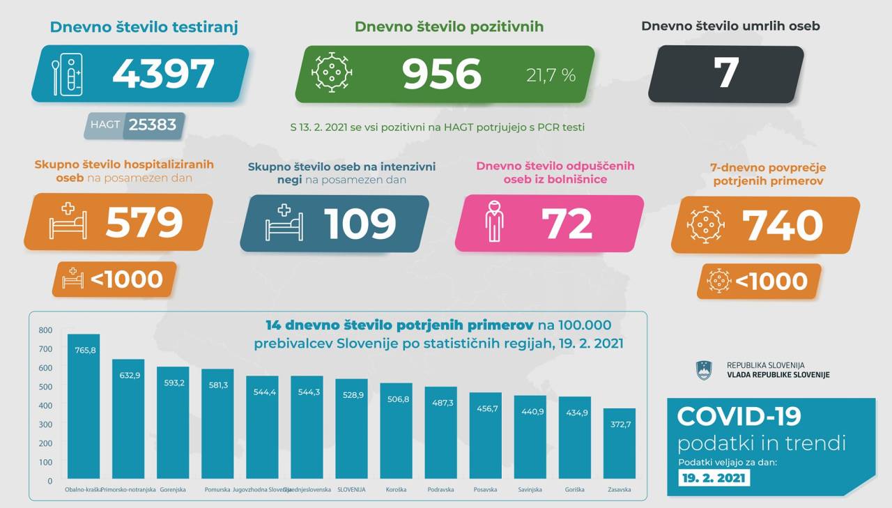 V Sloveniji so včeraj, 18. februarja, opravili 4397 PCR testiranj na koronavirus in potrdili 956 novih okužb, gre za 20-odstotni delež okužb.