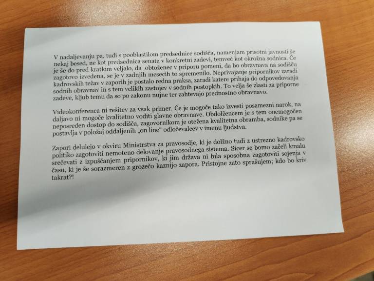 V protestnem pismu je med drugim zapisala: »Neprivajanje pripornikov zaradi kadrovskih težav v zaporih je postalo redna praksa, zaradi katere prihaja do odpovedovanja sodnih obravnav in s tem velikih zastojev v sodnih postopkih.«