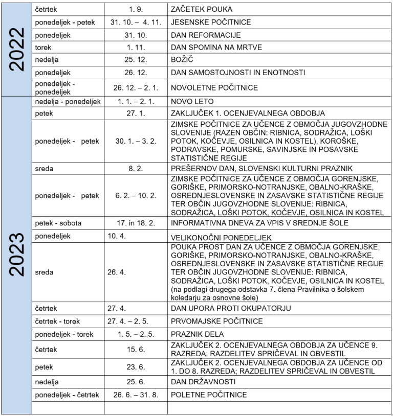 Šolarji se bodo dva meseca po začetku pouka razveselili jesenskih oziroma krompirjevih počitnic, ki jih bodo imeli od 31. oktobra do 4. novembra. Sledijo novoletne počitnice, ki bodo trajale od 26. decembra do 2. januarja. Sledijo zimske počitnice.