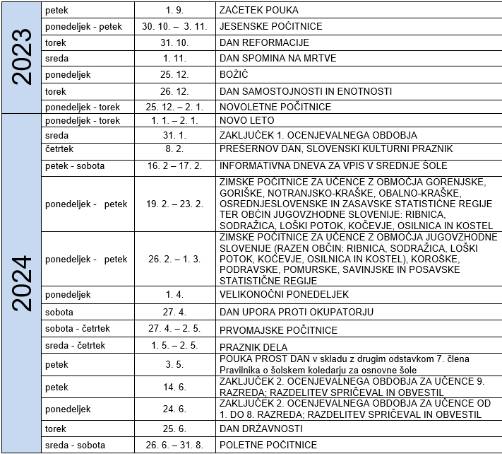 Novoletne počitnice bodo med 25. decembrom in 2. januarjem, zaključek prvega ocenjevalnega obdobja pa 31. januarja 2024.