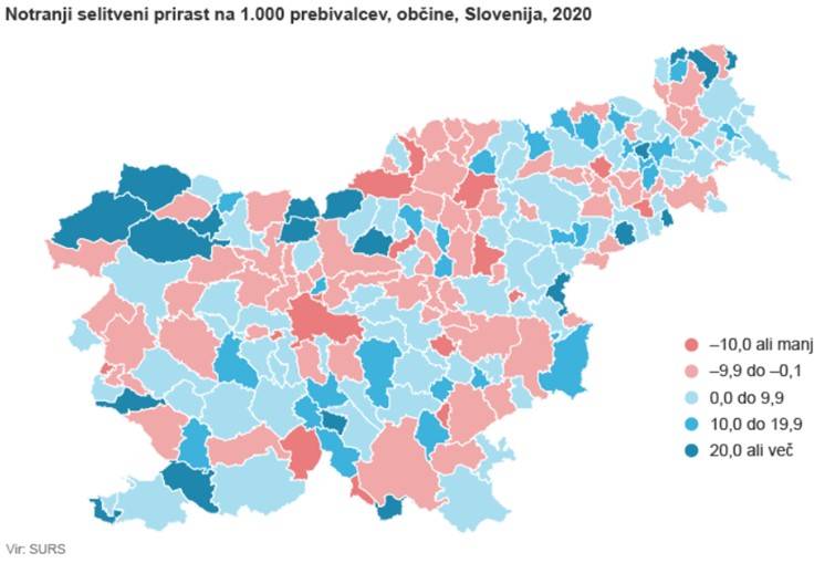 Od prebivalcev, ki so v letu 2020 prijavili spremembo naselja bivališča, se jih je večina preselila v drugo občino, 15 odstotkov pa se jih je preselilo v drugo naselje znotraj iste občine. Spremembo prebivališča je prijavilo približno 120.000 državljanov Slovenije in približno 20.000 tujih državljanov.