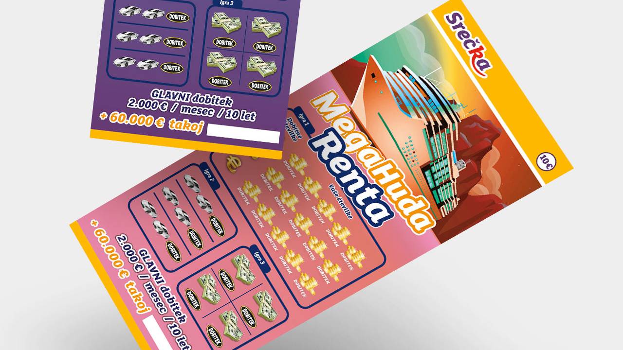 V bogati ponudbi iger Loterije Slovenije najdete tudi srečki Huda Renta in Mega Huda Renta, s katerima si lahko poleg enkratnega zneska pripraskate tudi mesečno rento za naslednjih 10 let.
