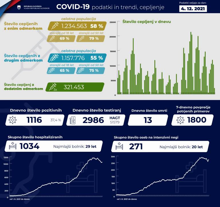 Trenutno je po podatkih Covid-19 sledilnika v bolnišnicah hospitaliziranih 1034 covidnih bolnikov, od tega je 271 pacientov na intenzivni negi.