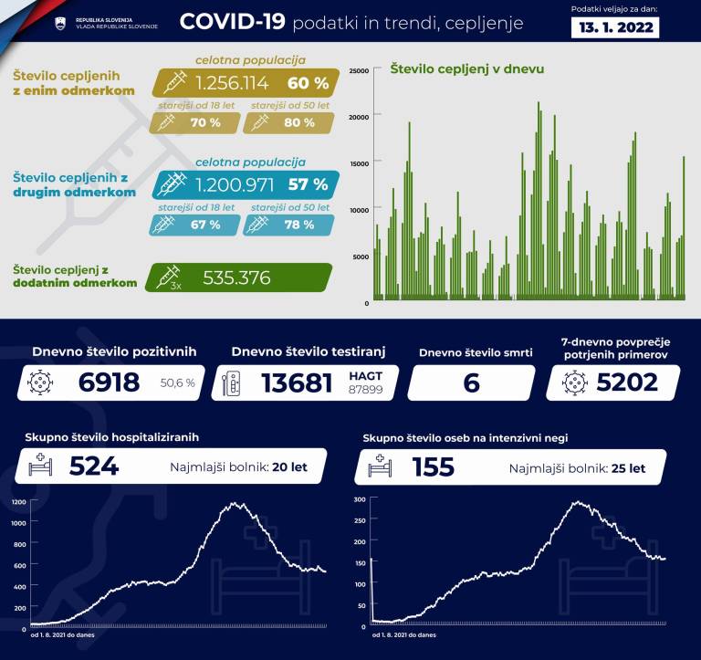 V Sloveniji so včeraj, 13. januarja, opravili 13.681 PCR testiranj na koronavirus in potrdili 6918 novih okužb, gre za 50,6-odstotni delež okužb.