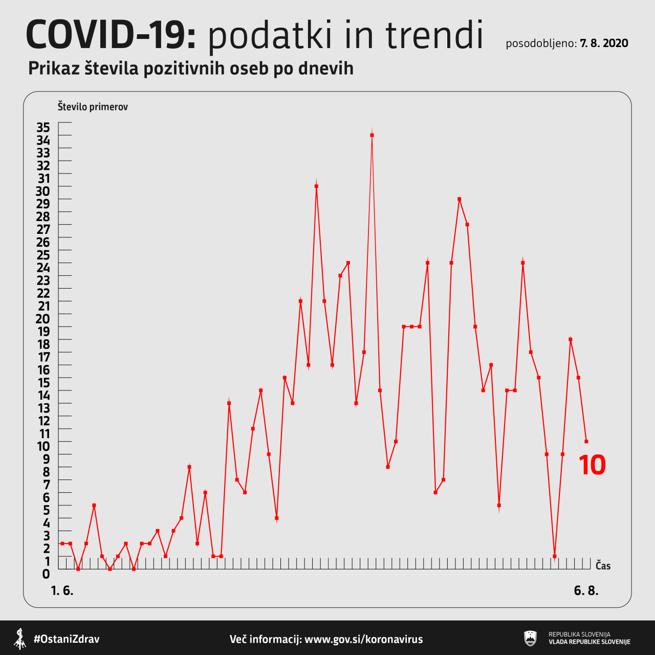 Potrdili so 10 novih okužb. Za primerjavo: dan prej so potrdili 15 novih okužb.