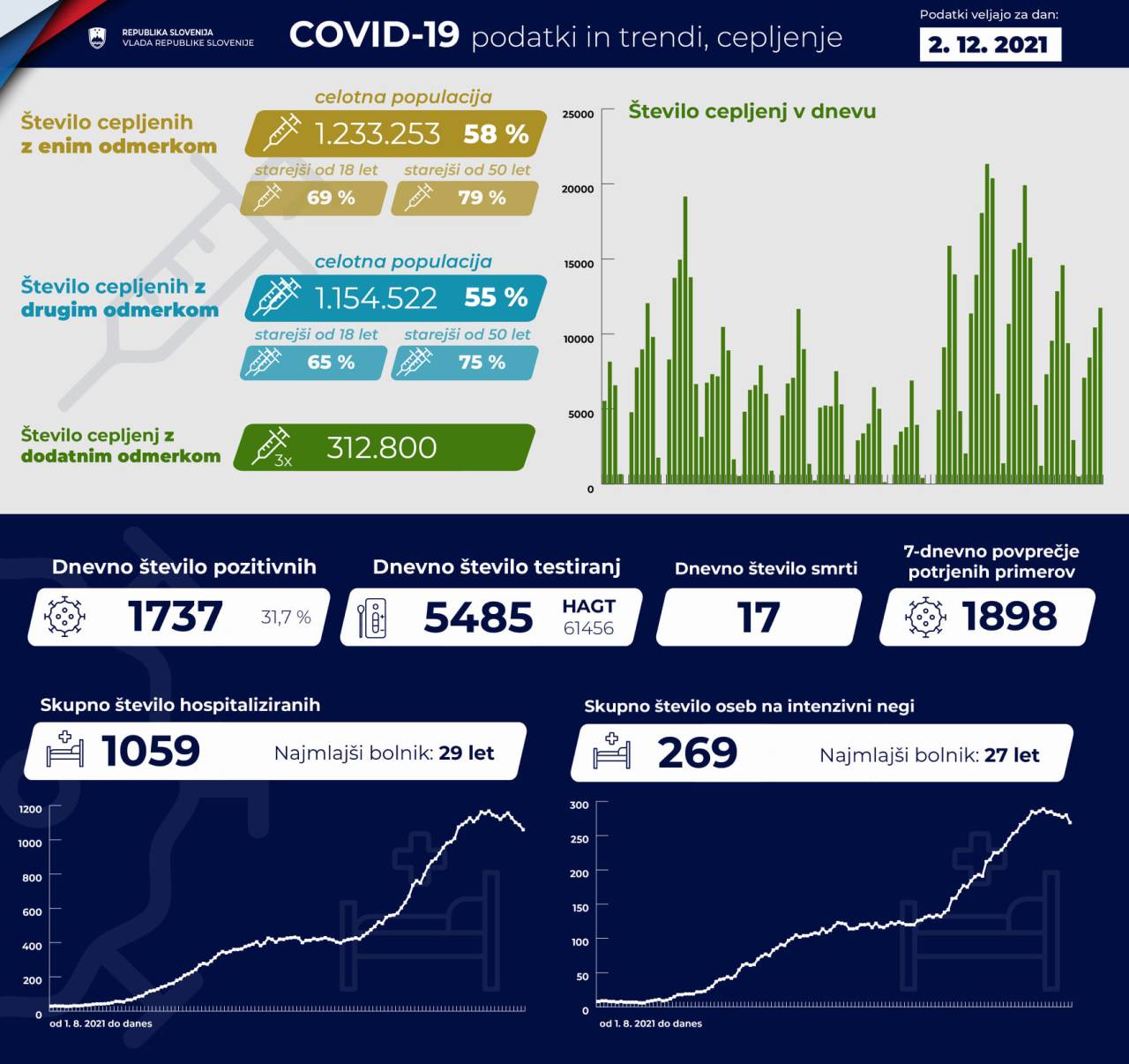 V Sloveniji so včeraj, 2. decembra, opravili 5485 PCR testiranj na koronavirus in potrdili 1737 novih okužb, gre za 31,7-odstotni delež okužb.