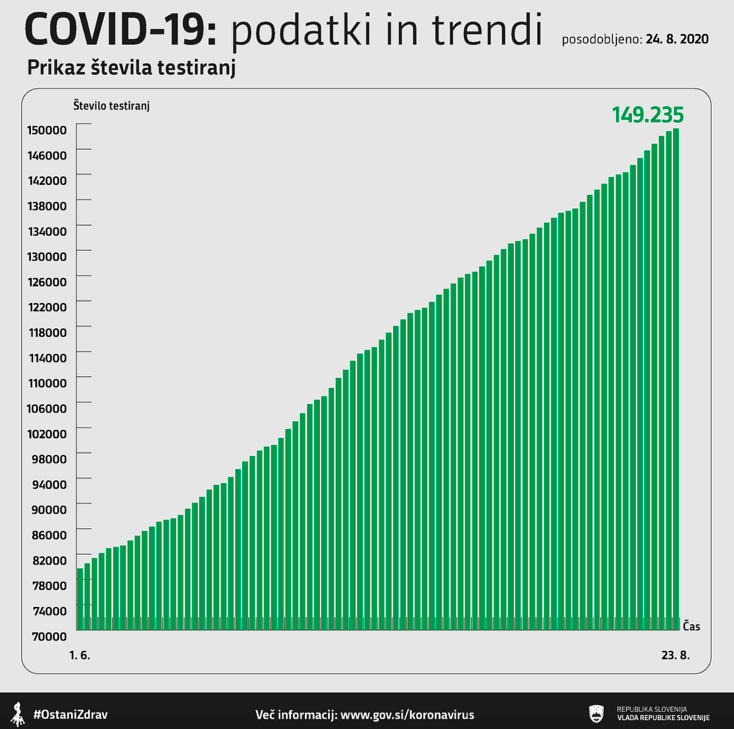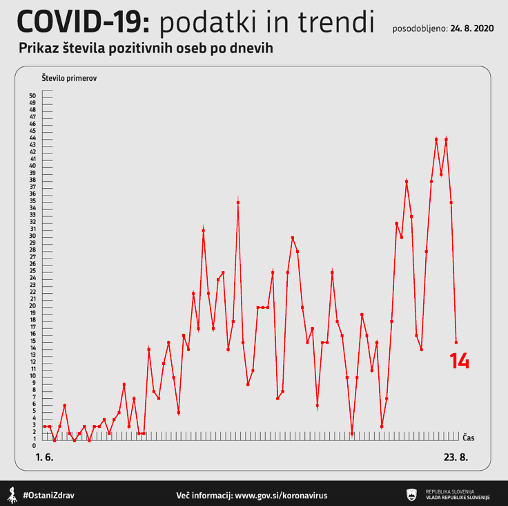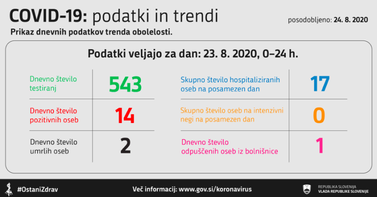 V Sloveniji so včeraj, 23. avgusta, opravili 543 testiranj na novi koronavirus. Potrdili so 14 novih okužb. Za primerjavo. Dan prej so potrdili 34 novih okužb ob 760 opravljenih testiranjih.