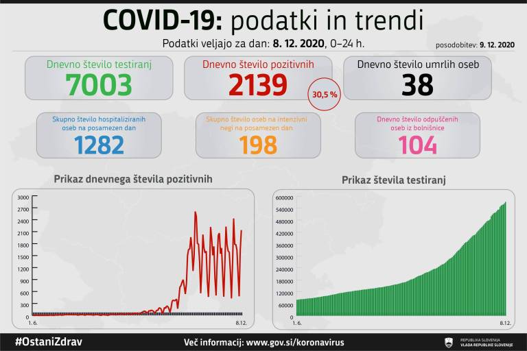 V Sloveniji so v včeraj, 8. decembra, opravili 7003 testiranj na koronavirus in potrdili 2139 novih okužb. To pomeni, da je bil delež pozitivnih testov tokrat 30,5-odstoten.